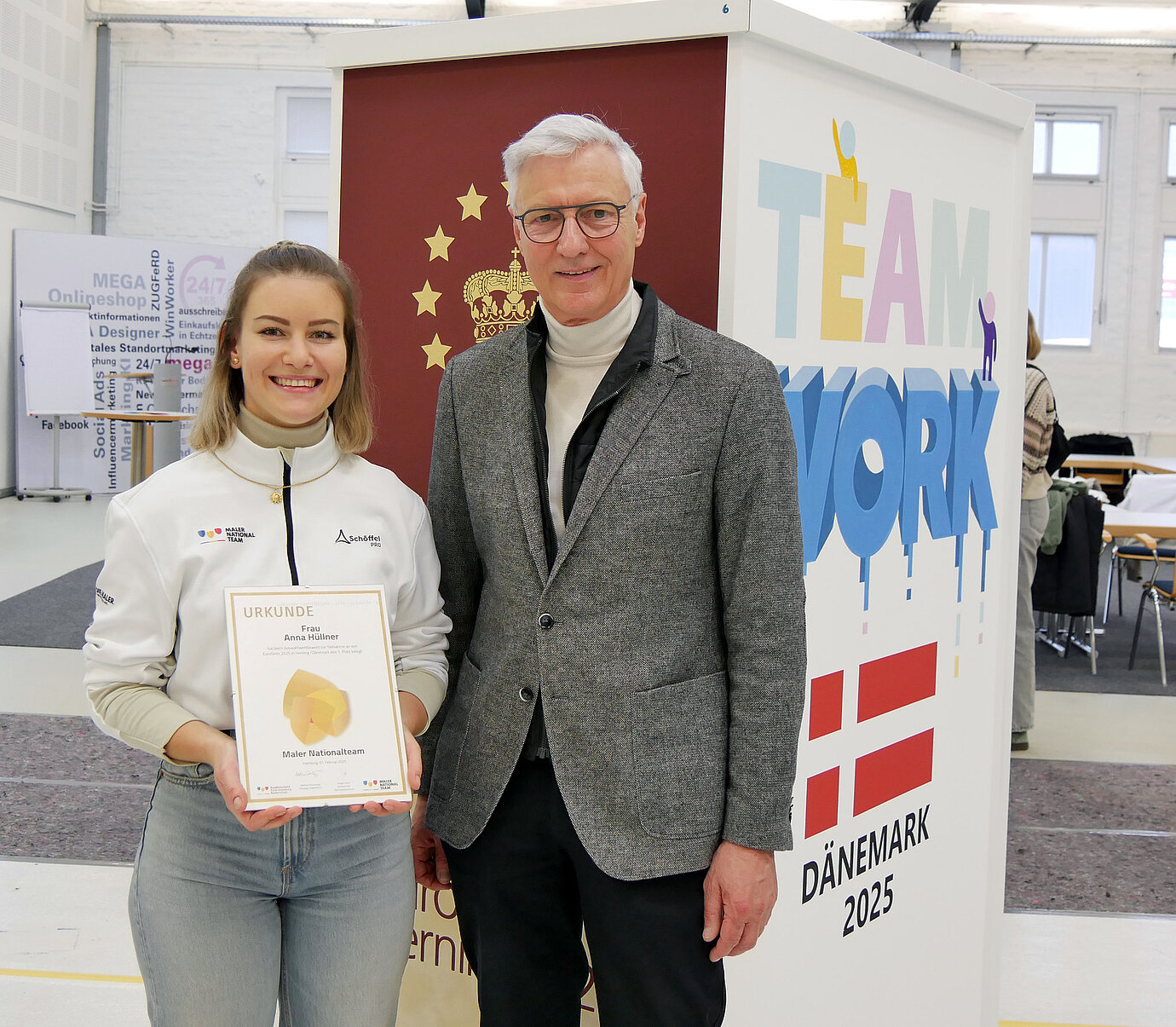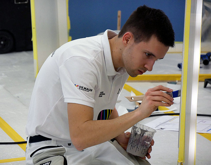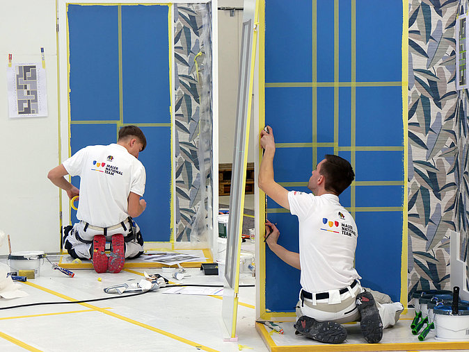 An zwei Wettbewerbstagen stellten die jungen Nachwuchstalente ihr Können unter Beweis. Neben Anna Hüllner traten auch Wilma Trigatti, Tim Schäfer und Jan Engels an, um sich das begehrte Ticket zu den EuroSkills zu sichern. Dafür mussten sie sechs anspruchsvolle Aufgaben meistern, die ihnen maximale Präzision und handwerkliche Technik abverlangte. Neben dem Lackieren einer Tür und dem Tapezieren einer Mustertapete mit Versatz, standen auch ein Speed-Wettbewerb und ein vorgegebenes Design auf dem vollen Wettbewerbsprogramm. Die Disziplin „Freie Technik“, in der die Teilnehmenden ein eigenes Design an die Wand bringen, stand unter dem Motto „Dänemark“, dem Gastgeberland der kommenden EuroSkills.