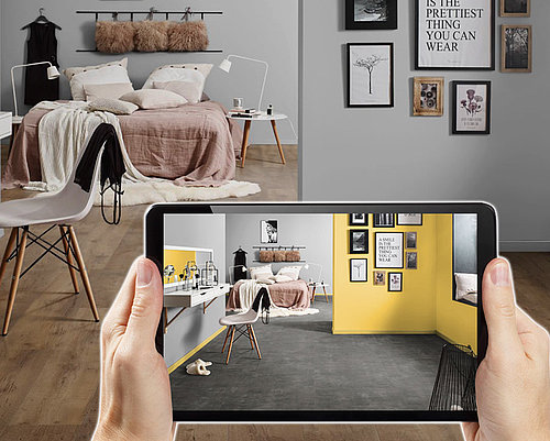 Testen Sie online die Wirkung verschiedener Böden, Tapeten und Wandfarben ganz individuell in Ihrem Raum.