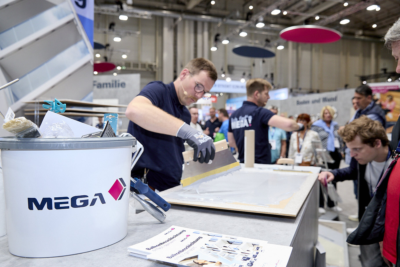 Auf der MEGA MESSE in der Messehalle A1 in Hamburg präsentierten tagsüber mehr als 100 Aussteller innovative Materialien, Werkzeuge und Maschinen für das Maler-, Bodenleger- und Stuckateurhandwerk sowie verwandte Gewerke. Messebesucher erwartete eine umfassende Sortiments- und Lieferantenvielfalt, die in der Branche seinesgleichen sucht. Ein Highlight am MEGA Messestand war die Vielzahl an praxisorientierten Live-Demonstrationen. Hier konnten die Besucher auf über 400 Quadratmetern Praxisfläche nicht nur neue MEGA Produkte kennenlernen, sondern auch direkt ausprobieren. Die MKB Mittelstandskreditbank AG offerierte interessante Finanzierungslösungen für das Handwerk. Ein umfassendes Unterhaltungsprogramm für die ganze Familie, der MEGA Fanshop und der MEGA Servicebereich mit Informationen rund um die MEGA Onlinewelt und dem GoldCard Kundenclub rundeten das Angebot der MEGA MESSE ab.